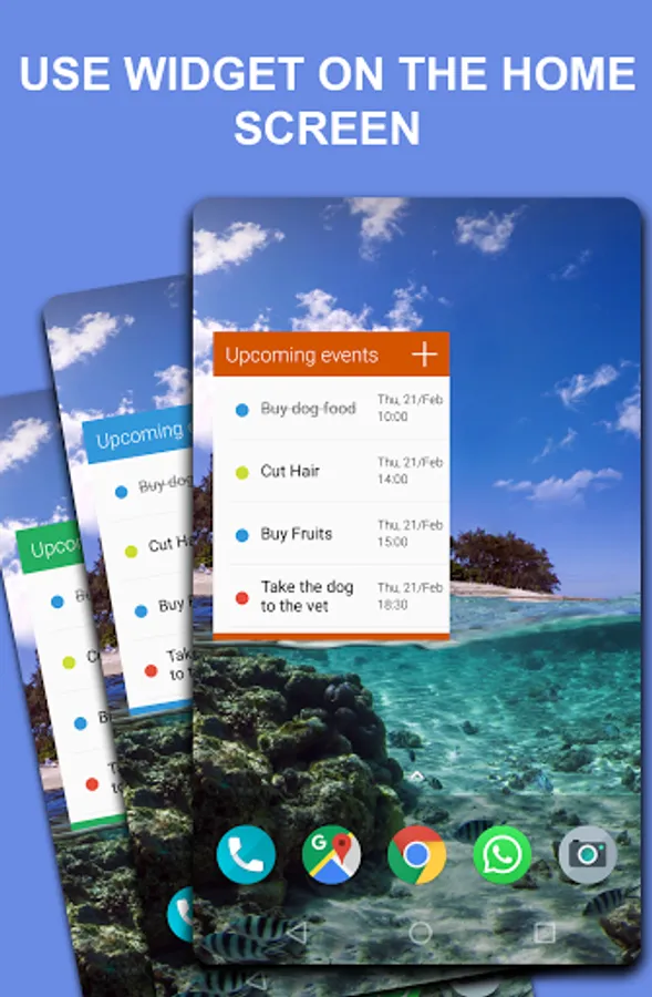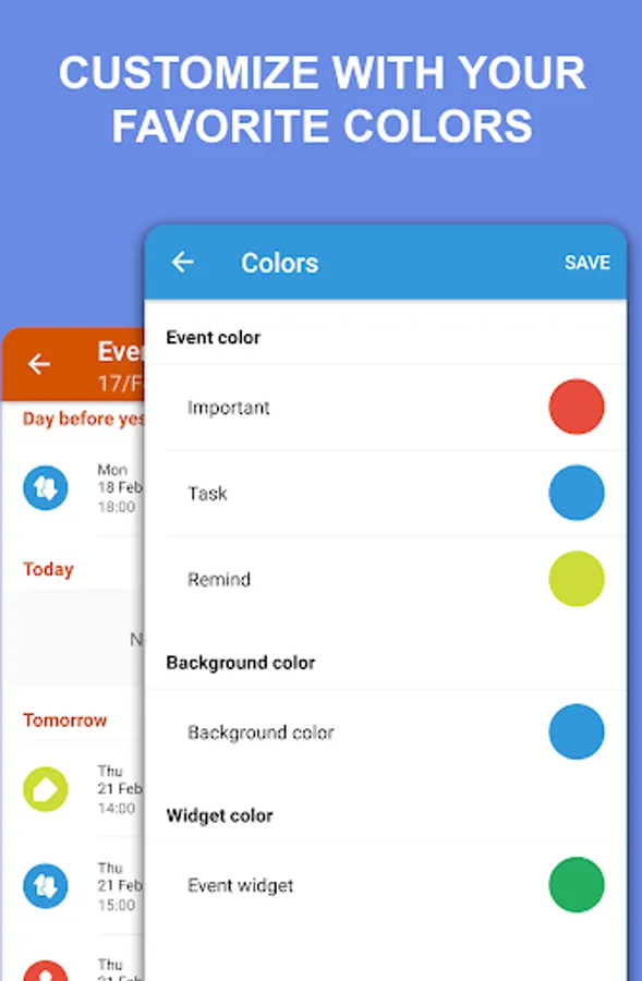 Personalize the app with your favorite colors , change the main color, event colors (important, task, reminder) and widget color.