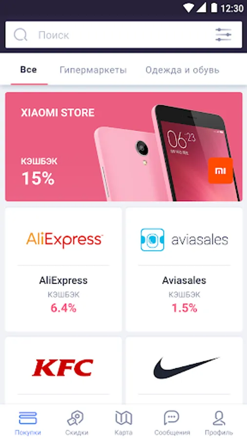 Choose the desired brand in the catalog, learn about the cashback rate available and visit the partner’s website to make a purchase. Companies you like can be added to Favorites.