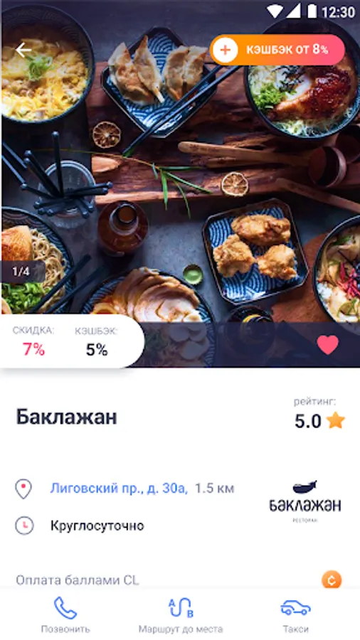 Choose the best places based on rating, description, discount amount, and cashback percentage. You can call the establishment directly from the app before visiting it.