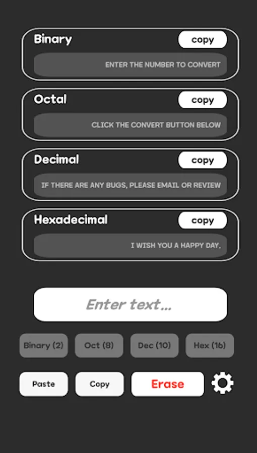 There is a ‘Copy’ button to copy the result value for each decimal number (binary, octal, decimal, hexadecimal).