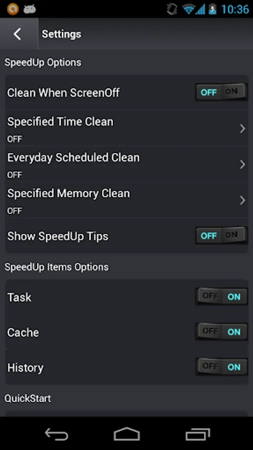 Clean When ScreenOff / Regular Clean / Scheduled clean / Clean when memory reached to a rate / Show SpeedUp Tips / Selection of Speed Up items / Quick launch icon / White list (task) / White list (privacy history) / Delay Wi-Fi Self-Close Time