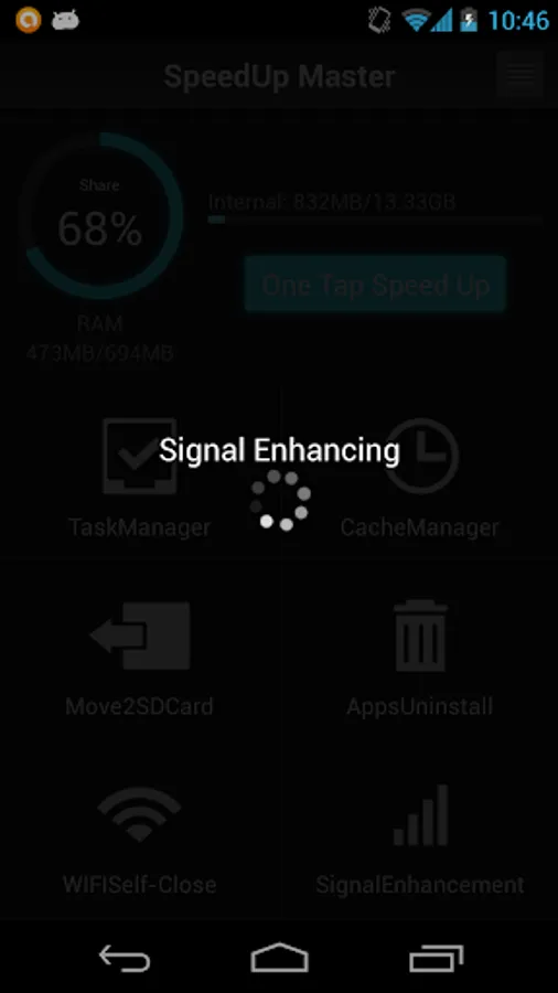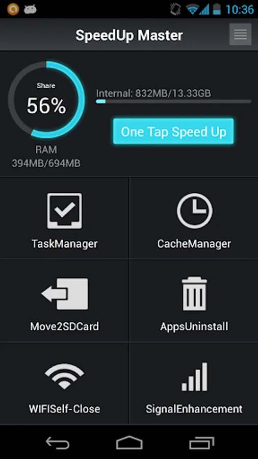 One-Tap Speed up/ Automatic Speed Up / Task Clear / Cache Clear / HistoryClear / App Uninstall / App2SDcard / Wi-Fi Self-Close / Signal Enhancement