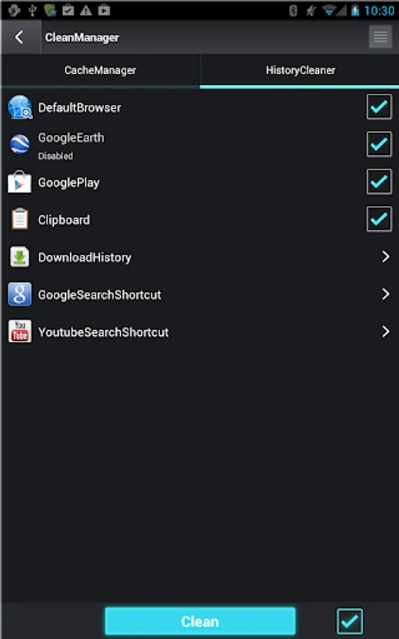 Just tap once the 'One-Tap Speed Up' button, you can run task clear and cache clear, historiy Clear, instantly.