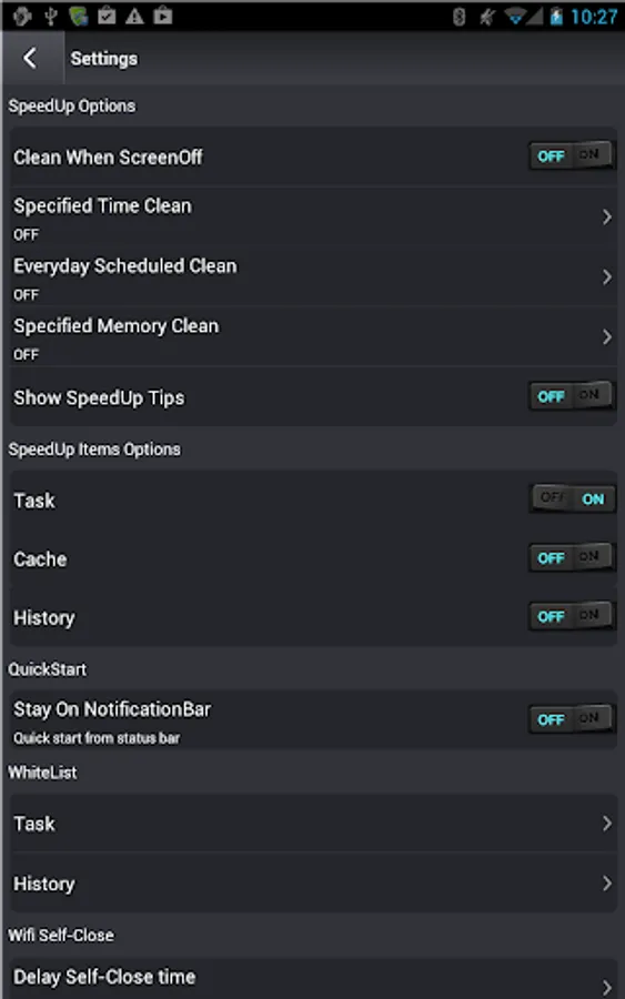 Clean When ScreenOff / Regular Clean / Scheduled clean / Clean when memory reached to a rate / Show SpeedUp Tips / Selection of Speed Up items / Quick launch icon / White list (task) / White list (privacy history) / Delay Wi-Fi Self-Close Time