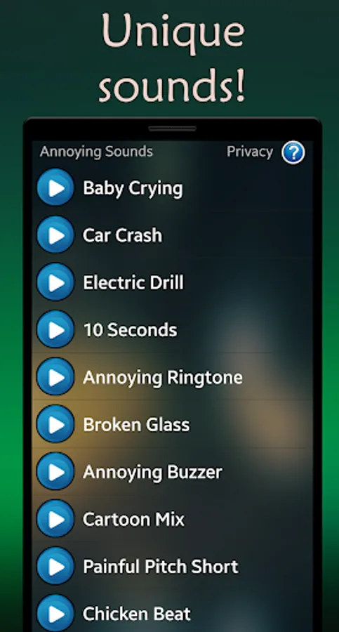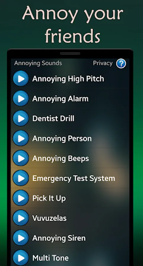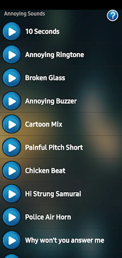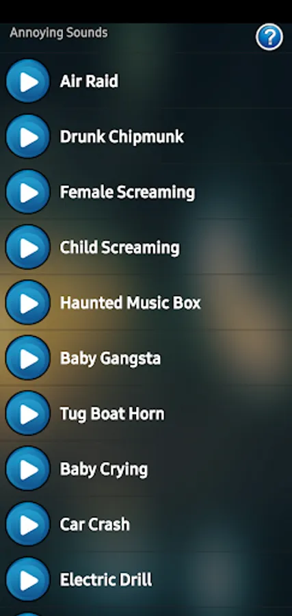 This application includes 45 of the most annoying ringtones and sounds known to man. Some are included just for fun, while others are scientifically proven to be the most annoying sounds to man.