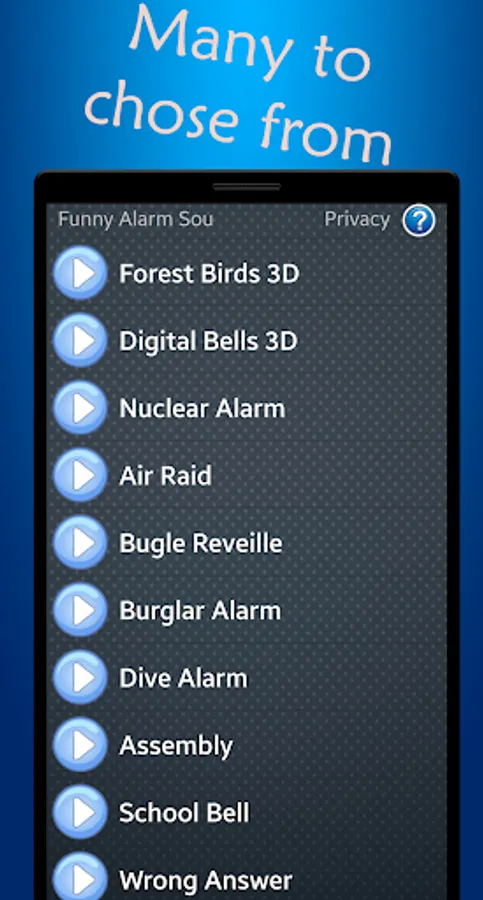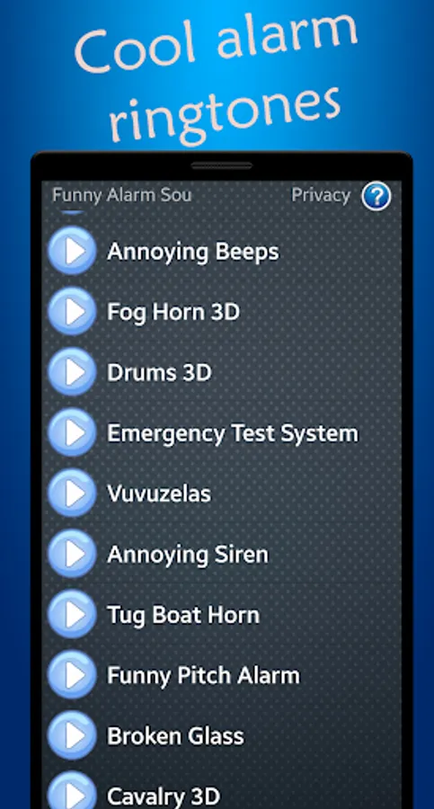 Funny alarm sounds is a free application that includes some of the most downloaded funny loud alarm ringtones from the internet grouped together in one application.