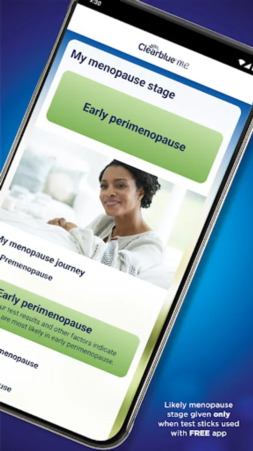 Menopause Stage - Clearblue® me app is designed for use with Clearblue® Menopause Stage Indicator tests to help you learn more about your menopause journey[1]. Used together with the easy-to-use follicle stimulating hormone (FSH) tests over several days, the app will indicate your likely menopause stage as premenopause, early perimenopause, late perimenopause or postmenopause. The more you learn about your stage, the better prepared you can be.