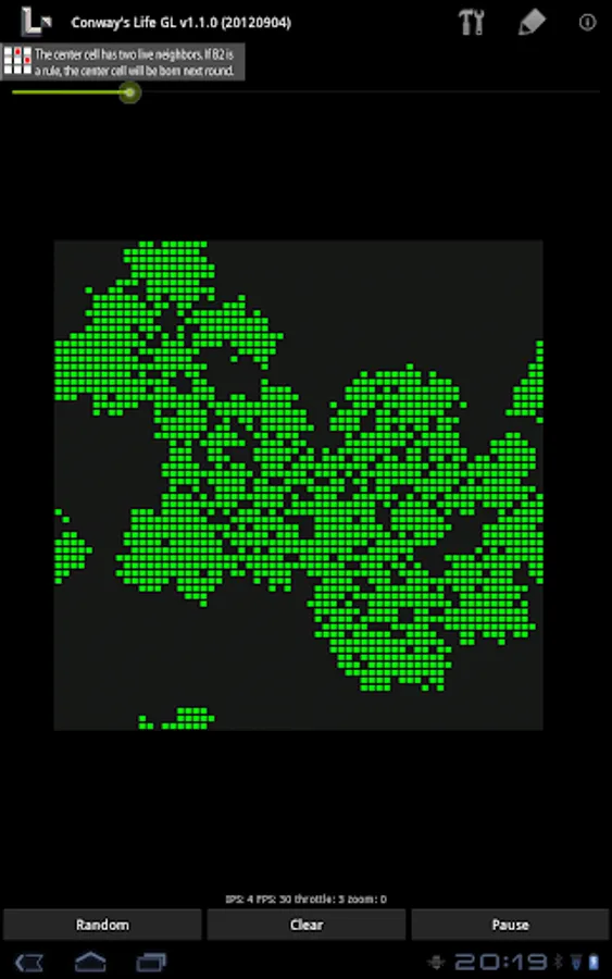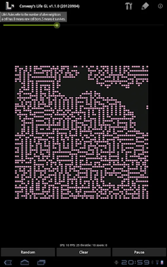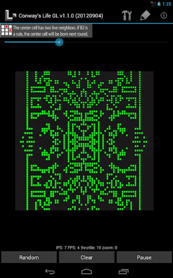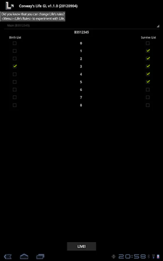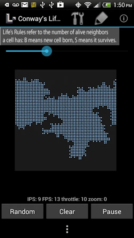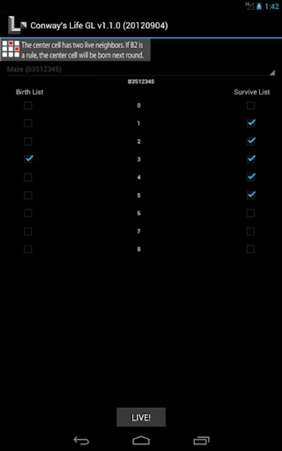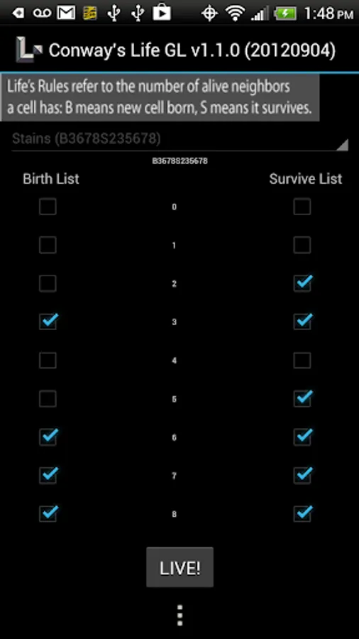 This fun app is a full featured Life Game, allowing the user to change the birth and survival rules to see the full range of two-dimensional cellular automata systems. See chaotic systems and slowly emergent systems, depending on the rules chosen. Vary colors, speed and shapes. No other Life Game implements rule setting.
