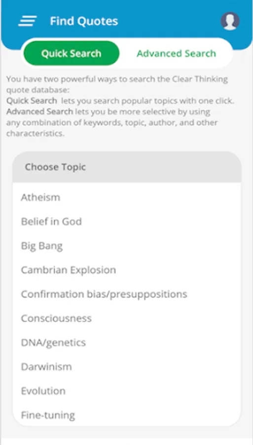 The Clear Thinking app gives you instant access to the best quotes about science & faith from 1500 experts at the intersection of science/faith/philosophy. There are over 10,000 quotes available to you on over 800 topics including science, philosophy, evolution, faith, logic, atheism, skepticism, intelligent design, origin of life, God, truth, Christianity, fine tuning, Darwinism, big bang, naturalism, morality, materialism, epigenetics, problem of evil, survival of the fittest, genetics, humanism, information, logical fallacies, theology, biases, racism, consciousness, rationality, science education, and religion.