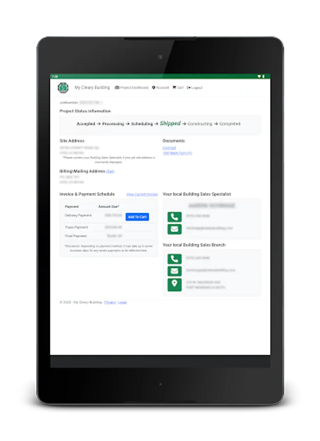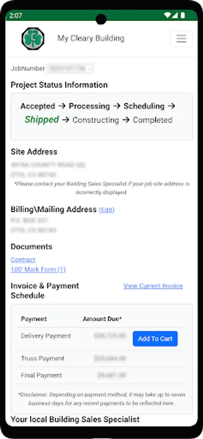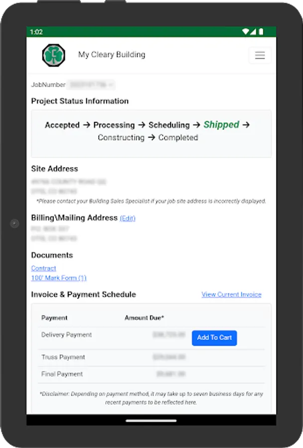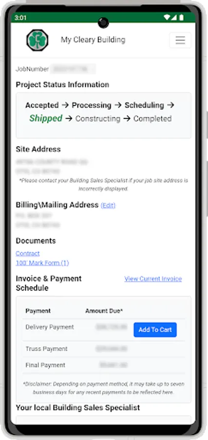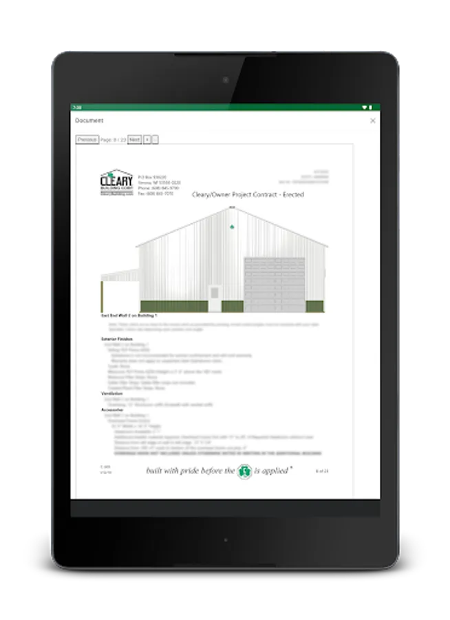 My Cleary Building is the official mobile app of Cleary Building Corp. As an industry leader in post frame construction, we have created an app to streamline the tracking of your building project. Quickly and easily reference important signed documents at any time during the construction process, verify the accuracy of contact information and conveniently make payments directly from your phone, tablet or desktop computer.