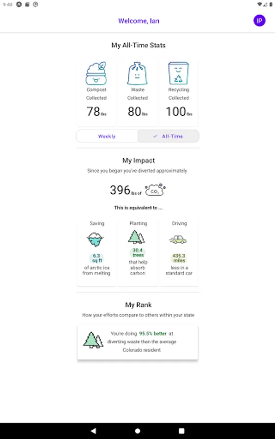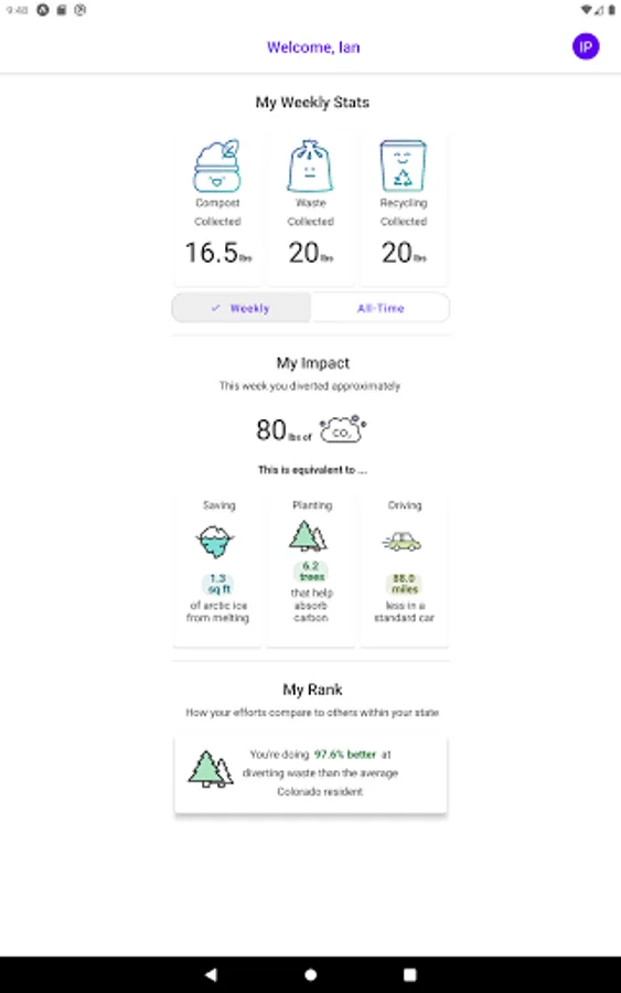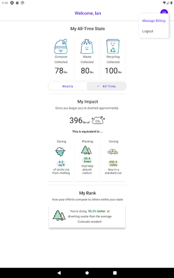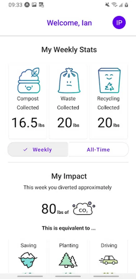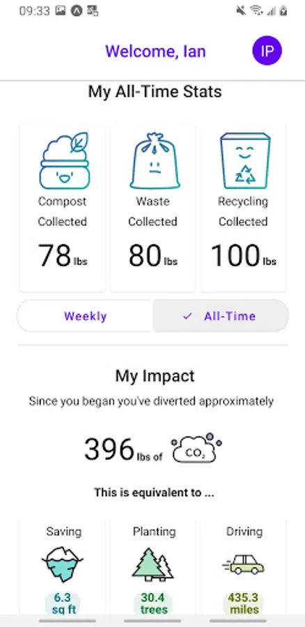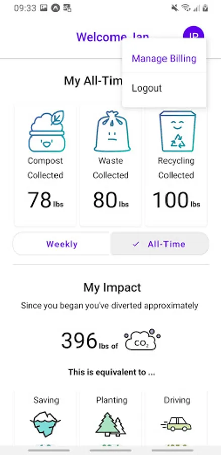 Track the impacts of your recycling, compost, and waste habits with Clementine Curbside. If you're already subscribed to our services you can view your impacts by week or over all-time.