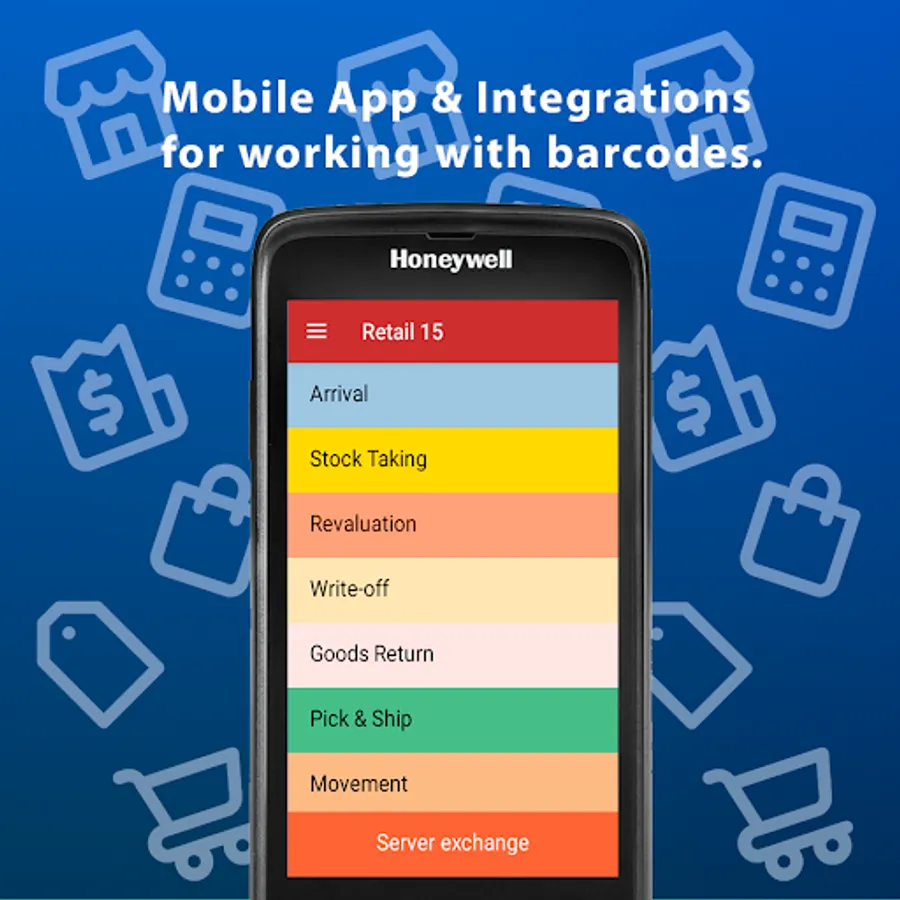 The program works on mobile devices with a barcode scanner or camera and on a PC (where you already have a core system installed) and exchanges data between the mobile device and your system in any convenient way: via cable, Wi-Fi or Internet.
