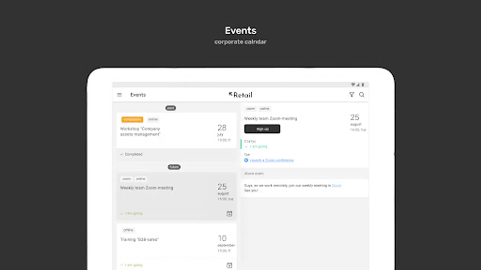 ⁃ Calendar of corporate events with “sign up to participate” feature