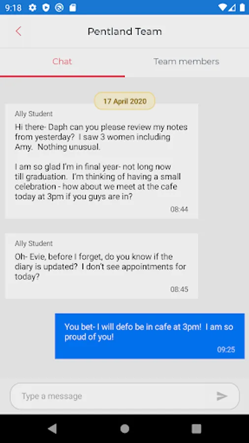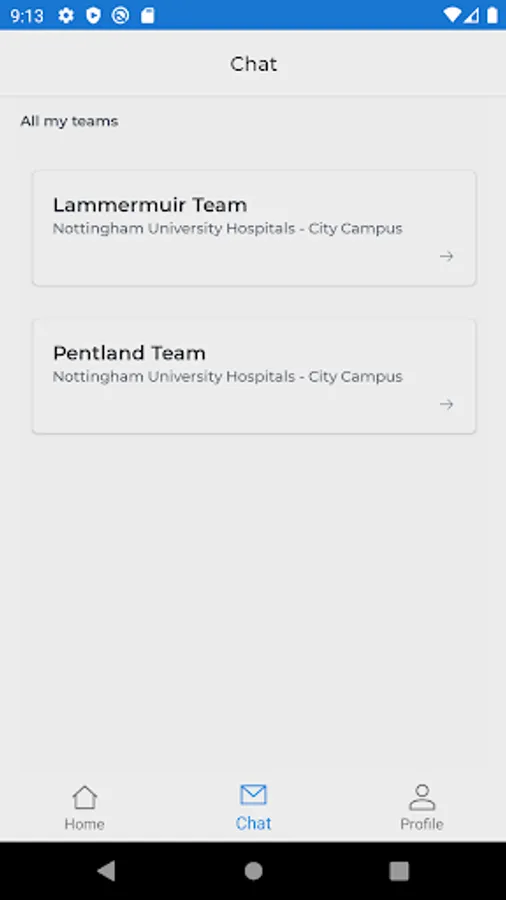 The focus is on user profiles and communication within teams. Teams are created within the clinical care records used at hospitals and visible within the application. By providing a secure channel for clinical teams to communicate, this lifts the risk of information to go awry and also protects the clinical users from using private messaging tools which may create an unwanted overlap with personal information.