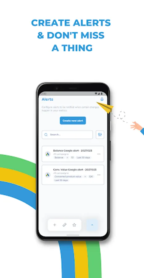 • Program manual alerts so you receive a notification when your ads metrics perform in a concrete way. Relax, disconnect and get notified when you choose to.