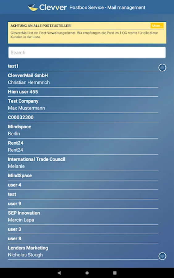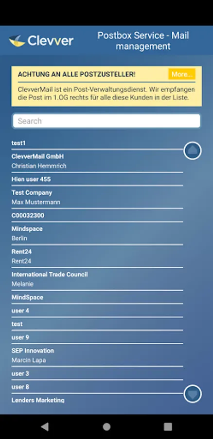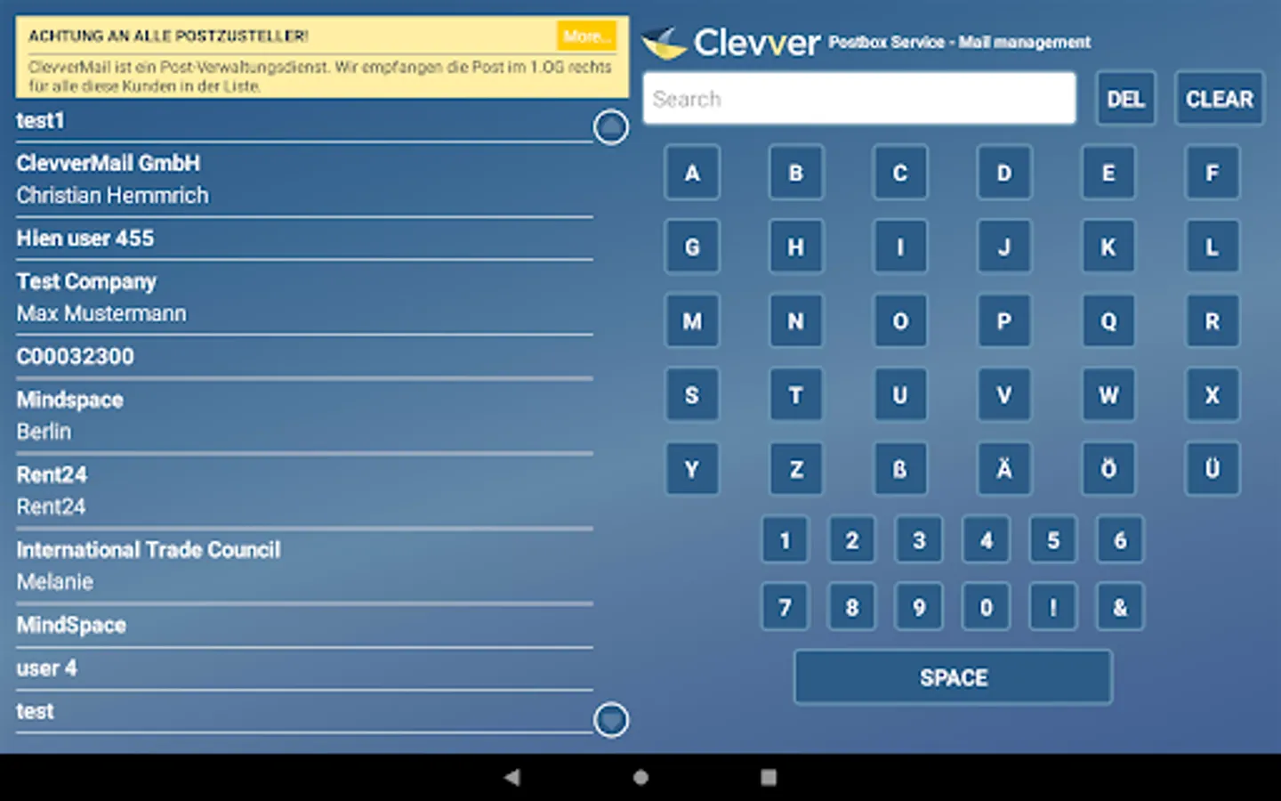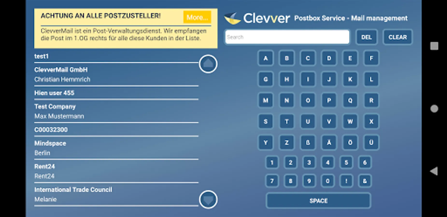 The ClevverBoard App is used for the ClevverMail Postbox Service, a virtual office service with business addresses all over the world. You can open a digital postbox or book a legal address for your company at each of those locations with the ClevverMail App or under www.clevver.io. All customers at those locations are then shown in this ClevverBoard App so that any postal service can find them.