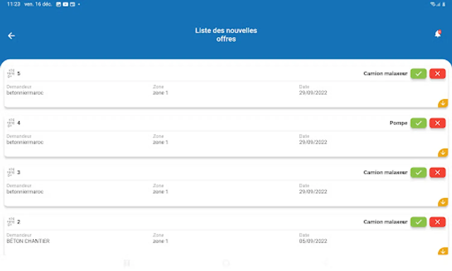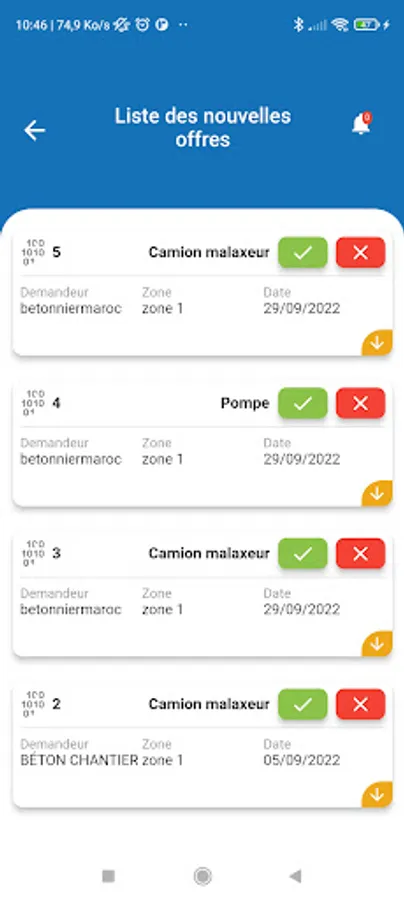 • Consult transport and pumping requests published by concrete mixers and construction companies subscribed to the system.