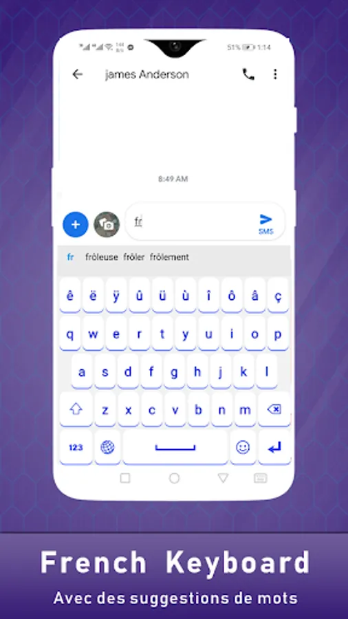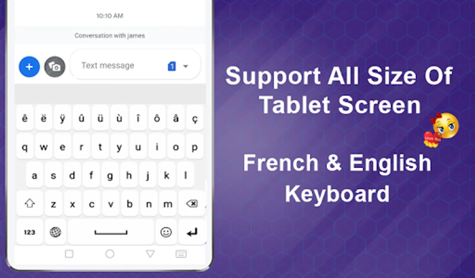 French and English keyboard for Samsung is fast typing keypad in search store. English to French typing keyboard is double languages keyboard of English French contain English French alphabets, characters, numeric. French typing keyboard has unique style, beautiful emoticons, cute emojis, stylish stickers, smileys .