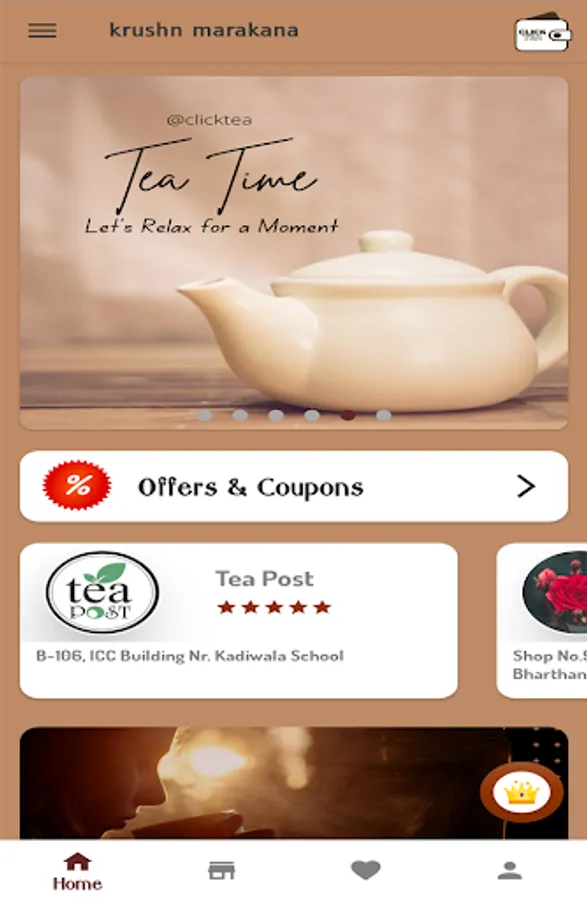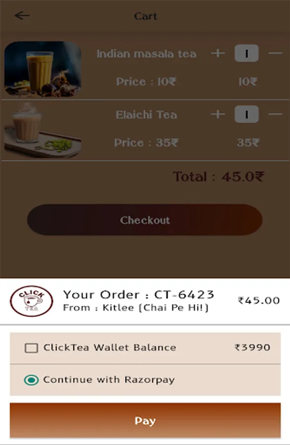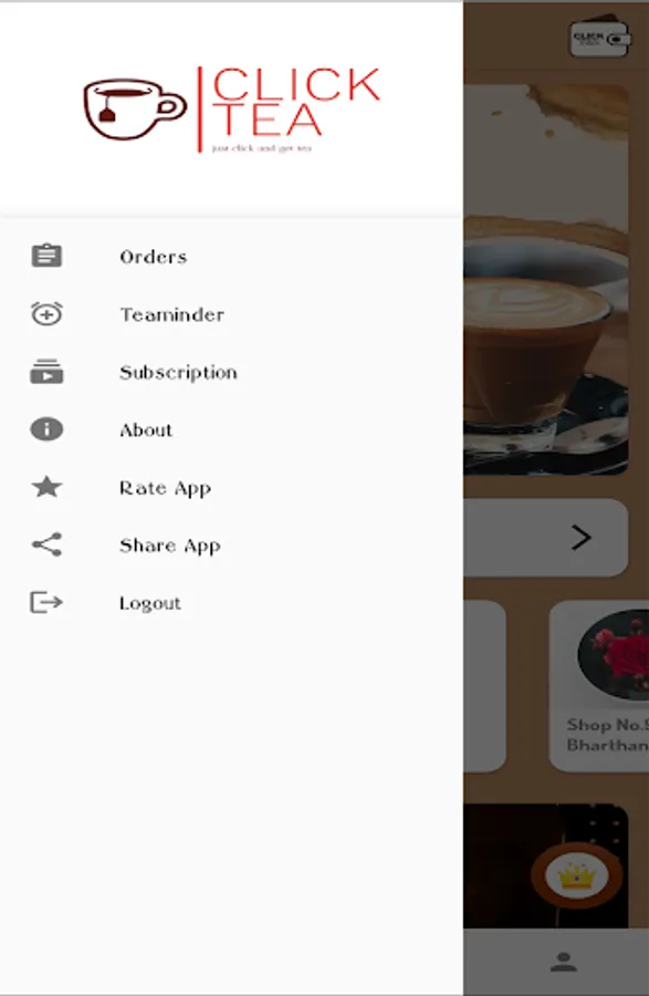 Click tea allows you to place order from nearby sellers and get delicious tea or snacks, eatable items to your door step within a shortest time With the help of click tea you not have to call your tea seller infront of your client with 2 click you can order and gave best guest experiance to your client.