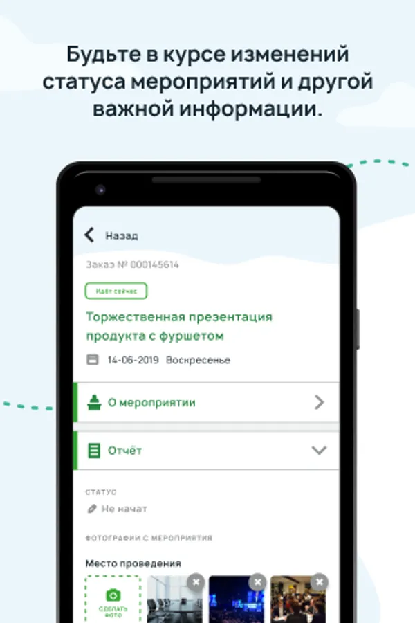 On the day of the event in the application, the initiator gets the opportunity to create a report by filling out the necessary uploading photos, documents and filling in the necessary fields. After sending, the data from the report is transferred to the main Click To MICE module, where it becomes available for analysis and further use.