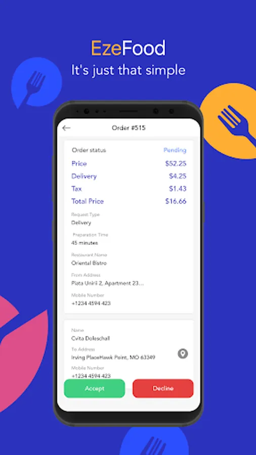 People order food through EzeFood, you receive the request to deliver the order, and you decide to take it or not, all on your app. All what you need is a smartphone, a valid driver license and a vehicle.
