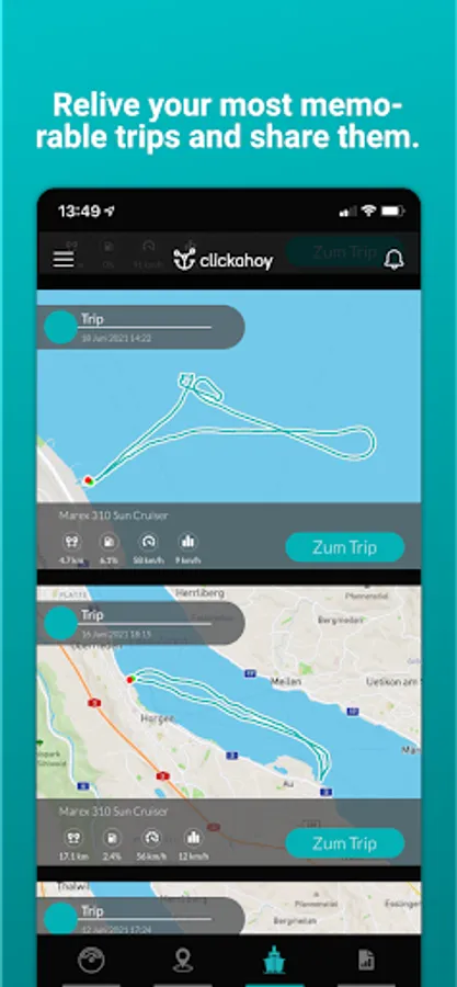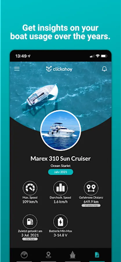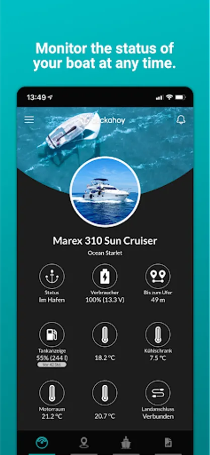 Connect live to your boat at any time and check all key functions. Configure warnings and prevent unexpected surprises. Receive evaluations of your trips and determine what you want to have analyzed. Share Insights with friends or just enjoy them for yourself and benefit from safety and protection. Anytime, unfiltered and reliable.