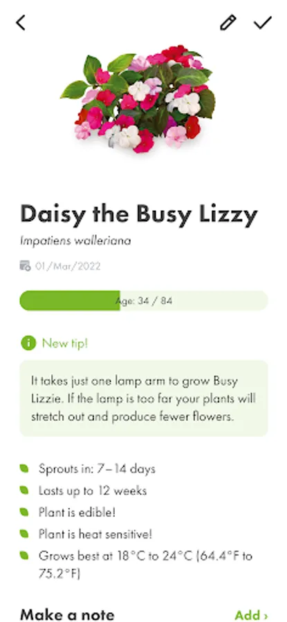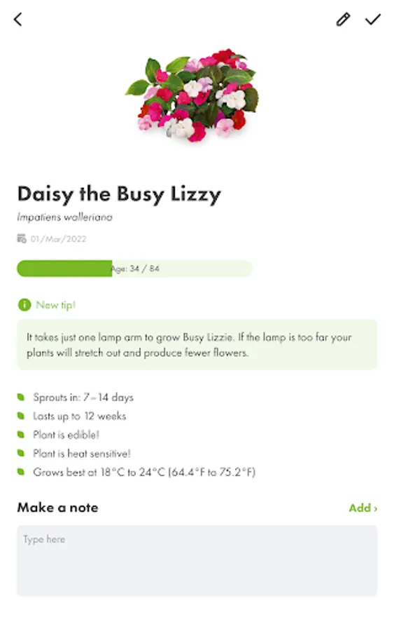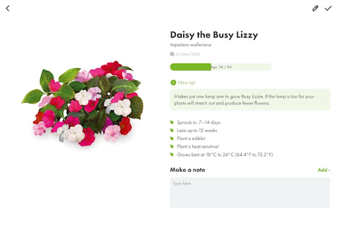 Access to the essential information of each plant (sprout time, growth temperature, ...) and add your own notes.