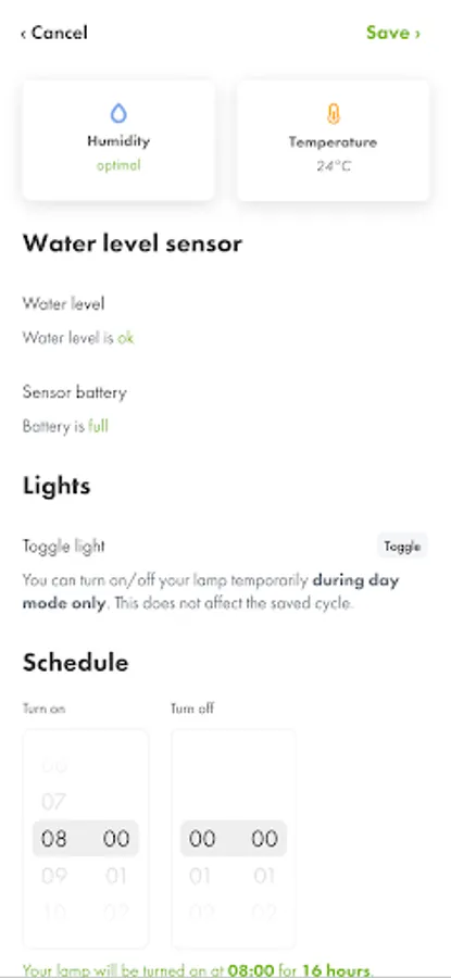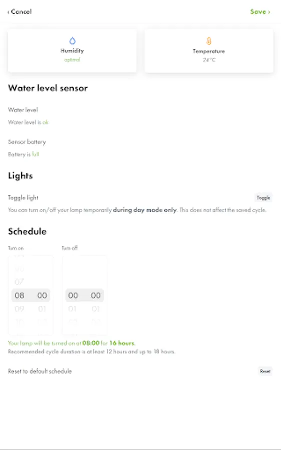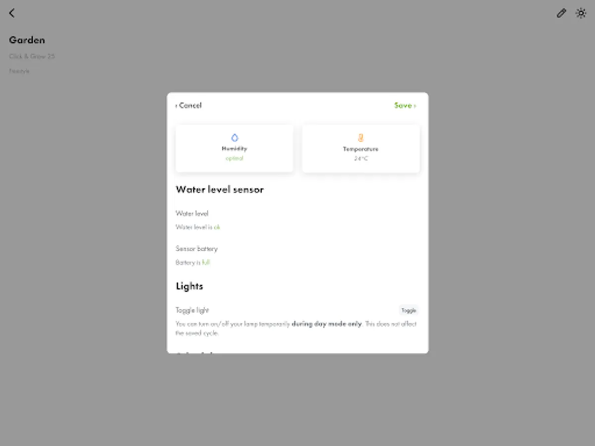 If you own a garden with Bluetooth capabilities like the Smart Garden 9 Pro or the Click & Grow 25, control the light (snooze, change the cycle start or length, ...) directly with the app.