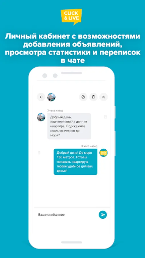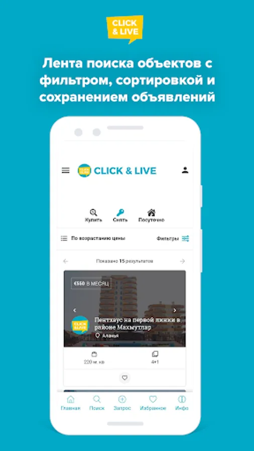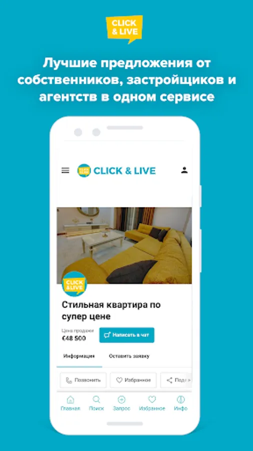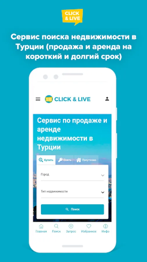 Click & Live is the first and only service for the sale and rental of real estate in Turkey for the Russian-speaking audience, in the format of a mobile application. With the help of our service, you can buy or rent apartments, houses and villas in Turkey for any period.