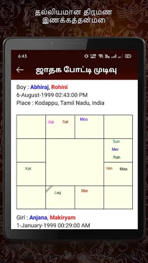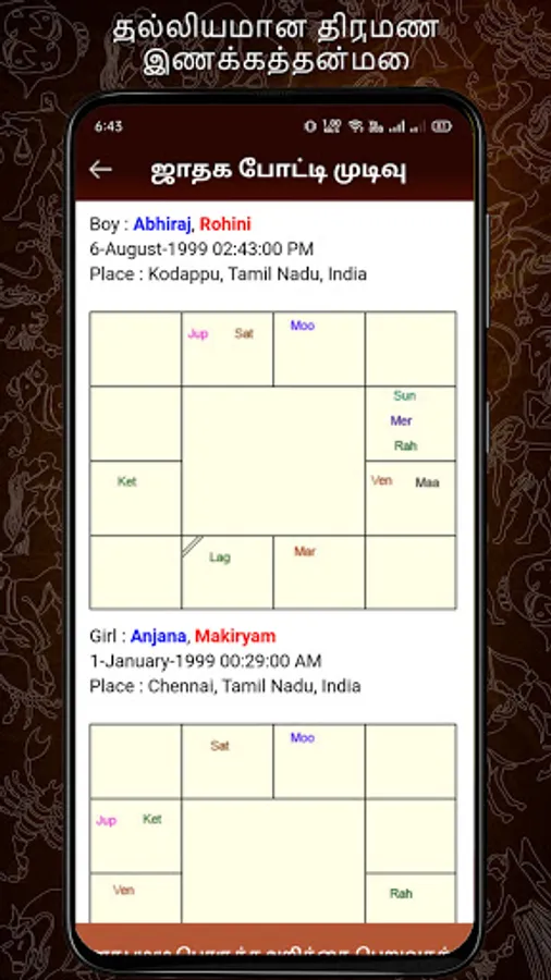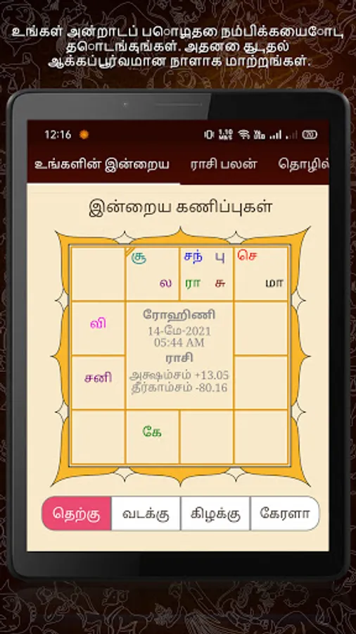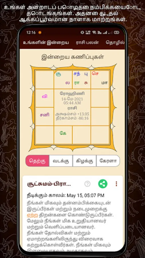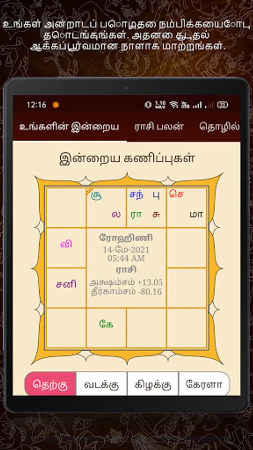 Horoscope in Tamil offers easy access to Jyothida kattangal, Raasi, navamsakam, bhava predictions, Dasa predictions, yogam, Jathaga porutham & lot more. It’s perfect for those who want to analyze their Jathagam. Horoscope in Tamil app provides Jothida palankal through inclusive analysis of jathagam & instantly generates grahanilai or birth chart in the preferred astrology chart style.