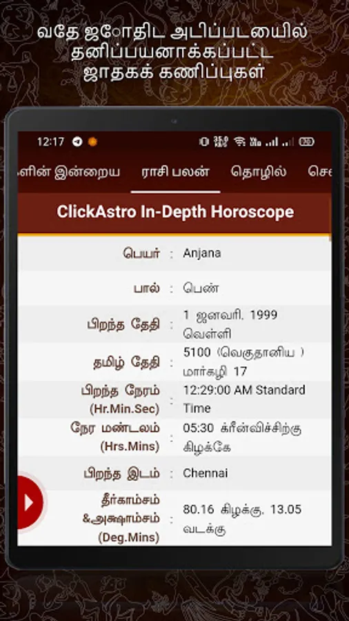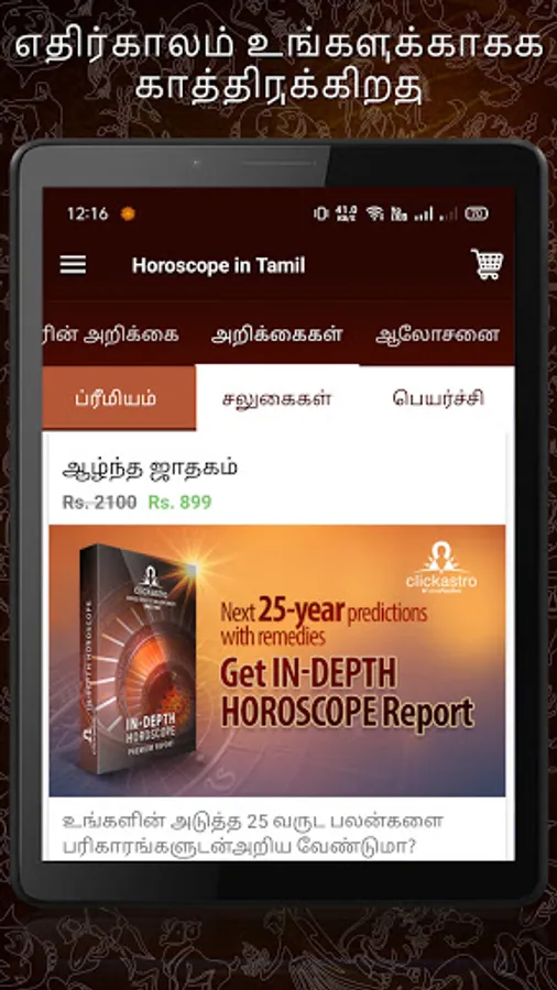 Horoscope in Tamil provides complete & accurate horoscope analysis based on Tamil Jothidam. This app is empowered by India's leading astrology website clickastro.com, was established in 1984 and a pioneer in providing digital astrology services with deep domain expertise.