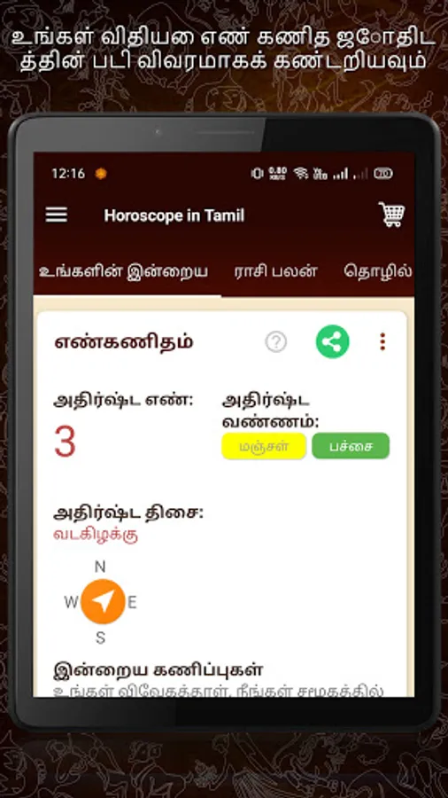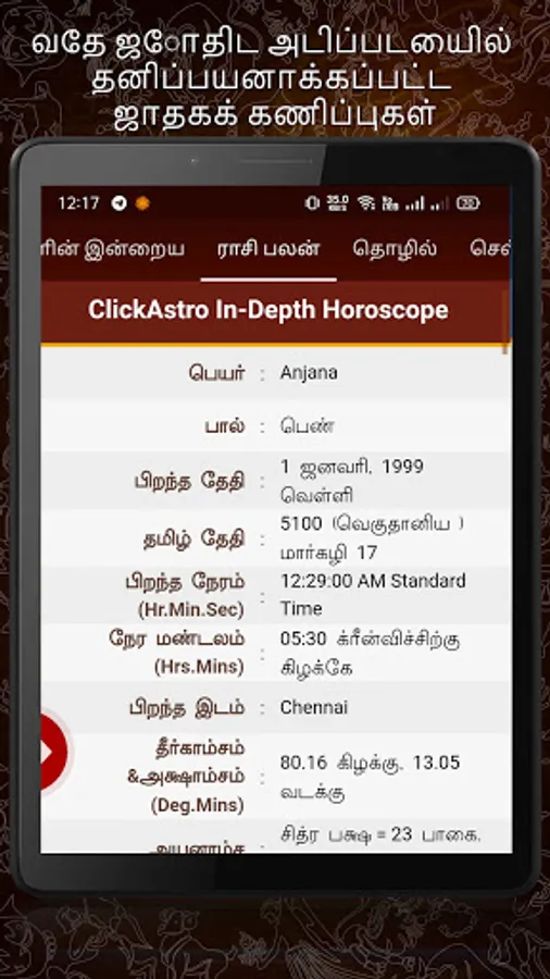 Daily Jathagam in Tamil is based on the prediction for sookshma / prana dasa in your horoscope. sookshma / prana dasa analysis is considered as a difficult summit to conquer in astrology. Horoscope in Tamil app helps you to get this unique prediction with ease. Make use of this personalized predictions as a guide for decision making in your daily life.