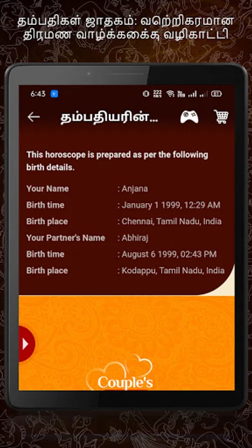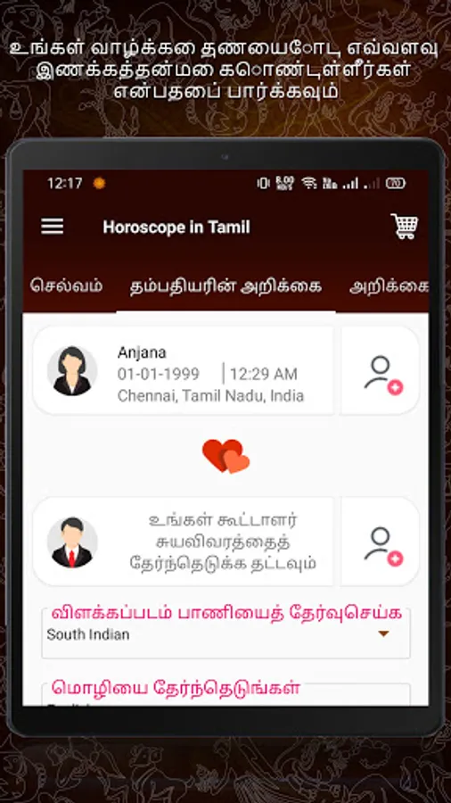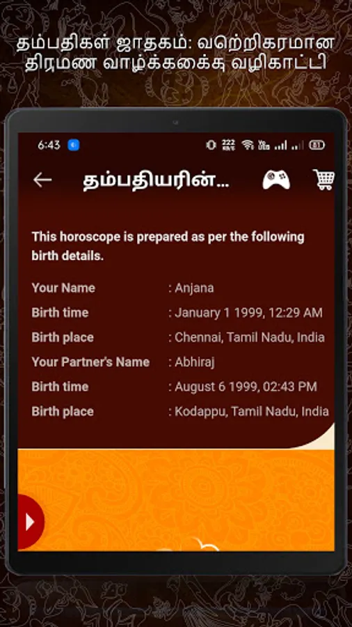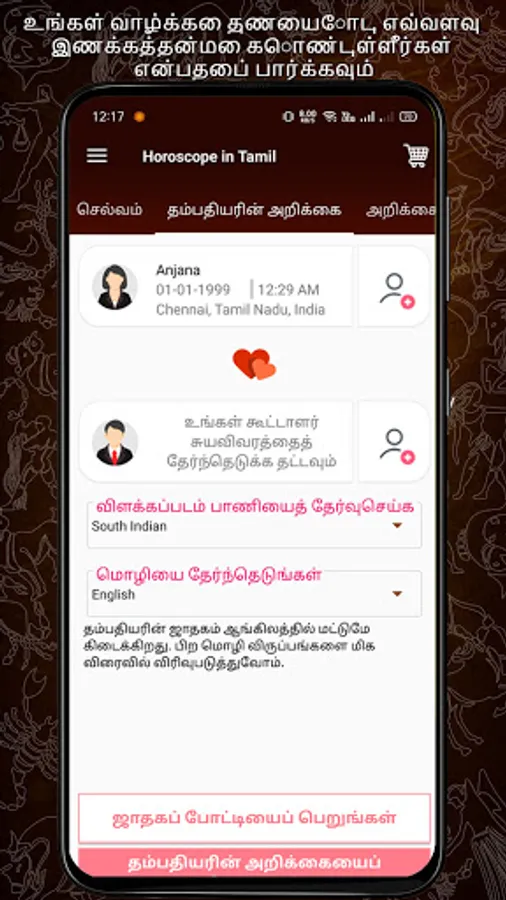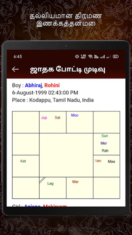 This horoscope app is based on Vedic astrology in Tamil gives accurate calculations and predictions, along with important astrological charts. Horoscope in Tamil helps you create an unlimited number of Tamil Jathagam for your family, friends & relatives. Go ahead, View and analyze personalized Tamil jathagam by entering birth details of your loved ones. The beauty of this feature is that it works OFFLINE!