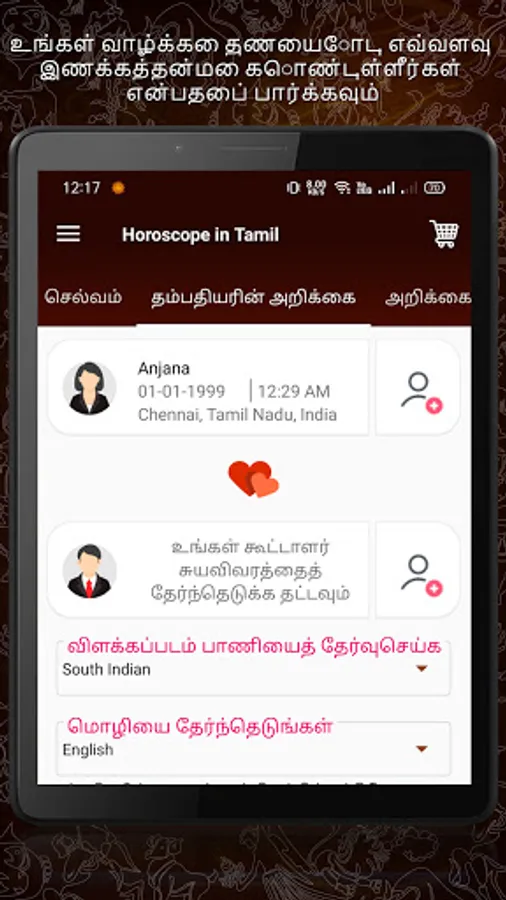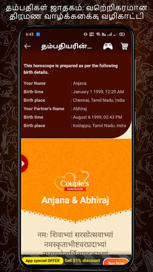 Thirumana porutham based on Vedic astrology in Tamil is another beautiful feature included in this Tamil Jothidam app. Finding the right partner is pivotal in the progress of life and choosing the right partner from marriage proposals is a bit confusing. Thirumana porutham or Horoscope matching helps us to know the marriage compatibility between groom & bride with ease. Jathaga porutham based on South India & North India, East India, Kerala matching methods are available in this Vedic astrology app.