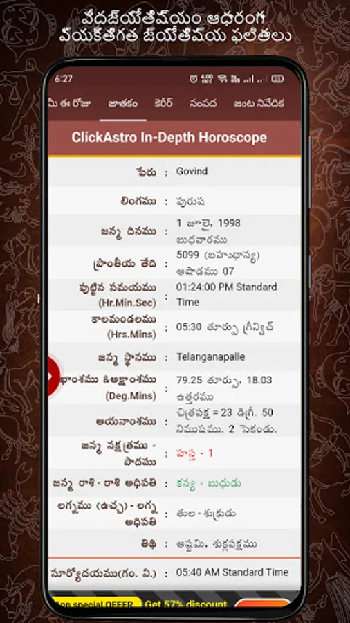 • Free Reports: You can access free horoscope in Telugu based on Telugu astrology by date of birth. All you are required to do is just enter your name and accurate birth details and you are good to go. You can also now access free career and wealth horoscope reports on the app.
