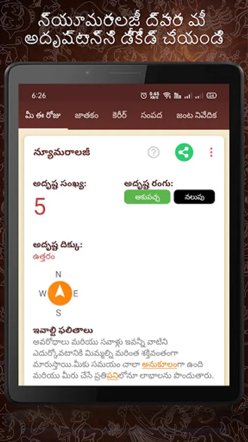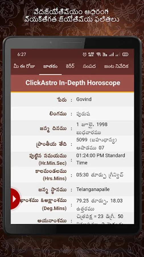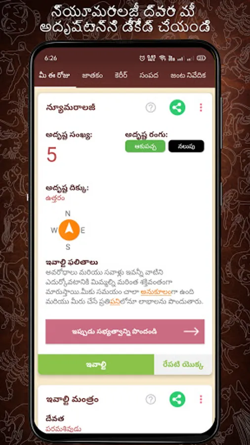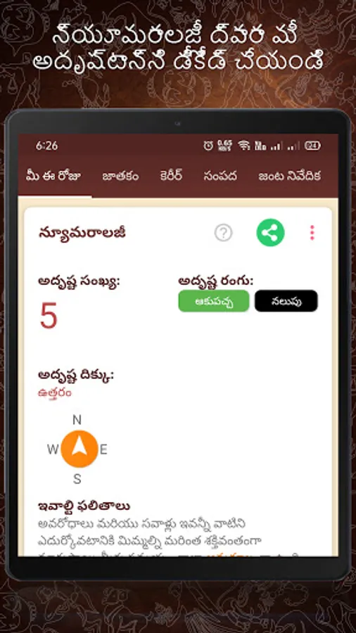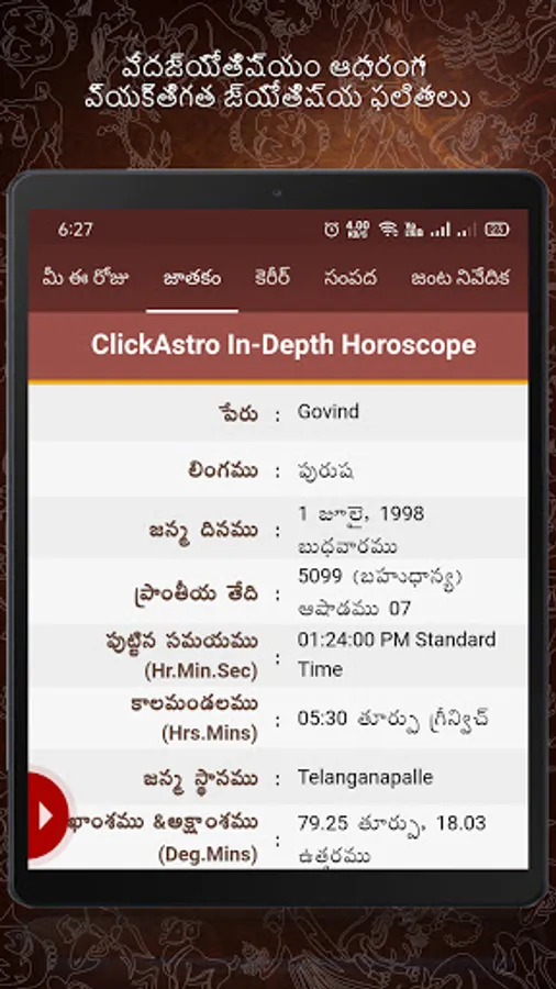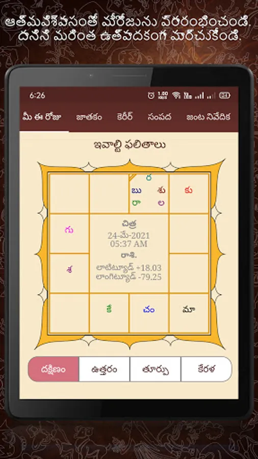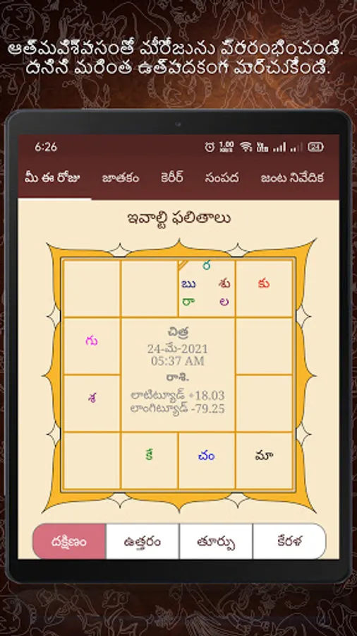 • Get daily horoscope in Telugu predictions based on your Sookshma & Prana Dasa.