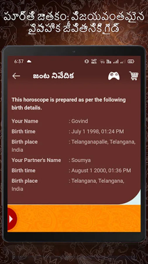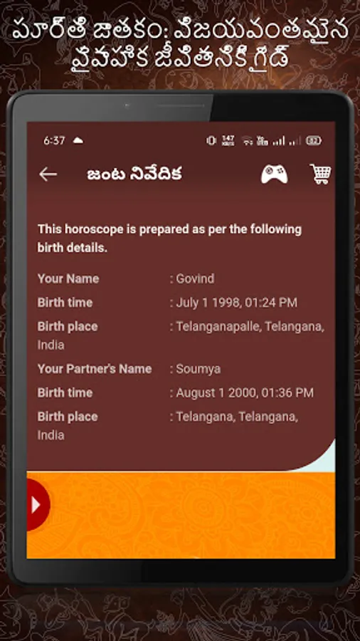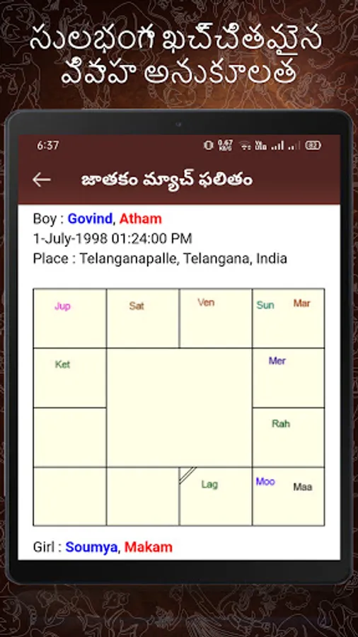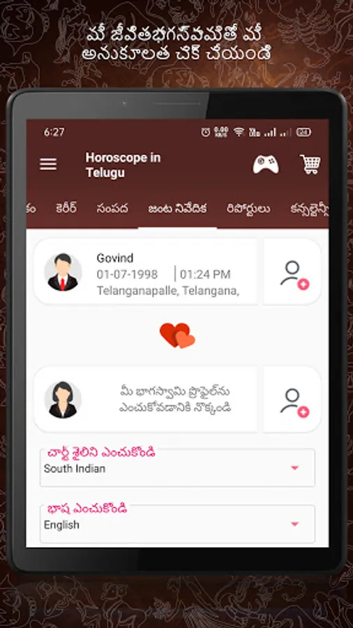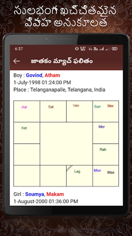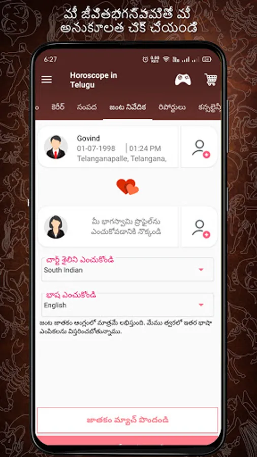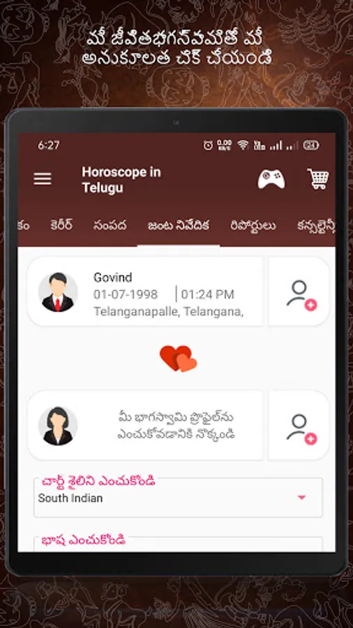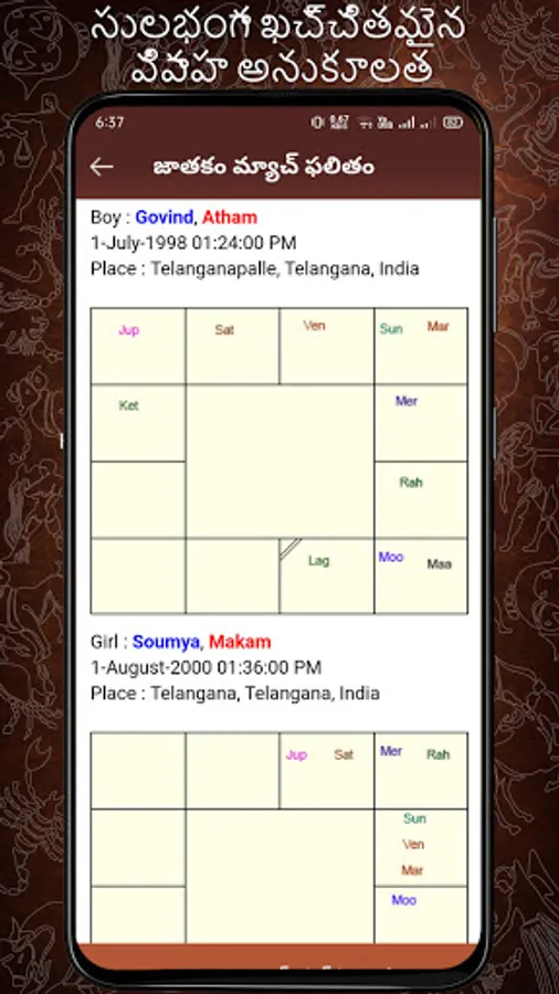 The Telugu Jathakam app also provides options for vivaha gunamelanam. Gain access to the love match report based on zodiac signs. In addition to the above, you can also generate the Couple’s horoscope report which guides the couple and provides guidelines to lead a fulfilling and happy married life.