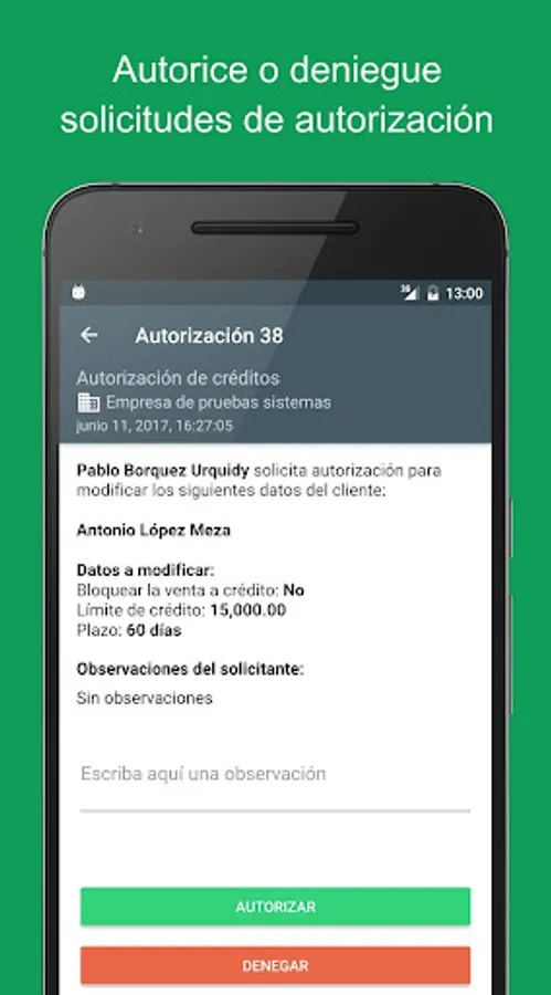 From ClickBalance system users will be able to request permissions to make requests for credits and discounts to Clients, in real time the request can be authorized from the manager's mobile device with the Authorizations application, as well as keep track of all approved authorizations and Denied, streamlining processes within companies and increasing employee productivity, generating effective sales.