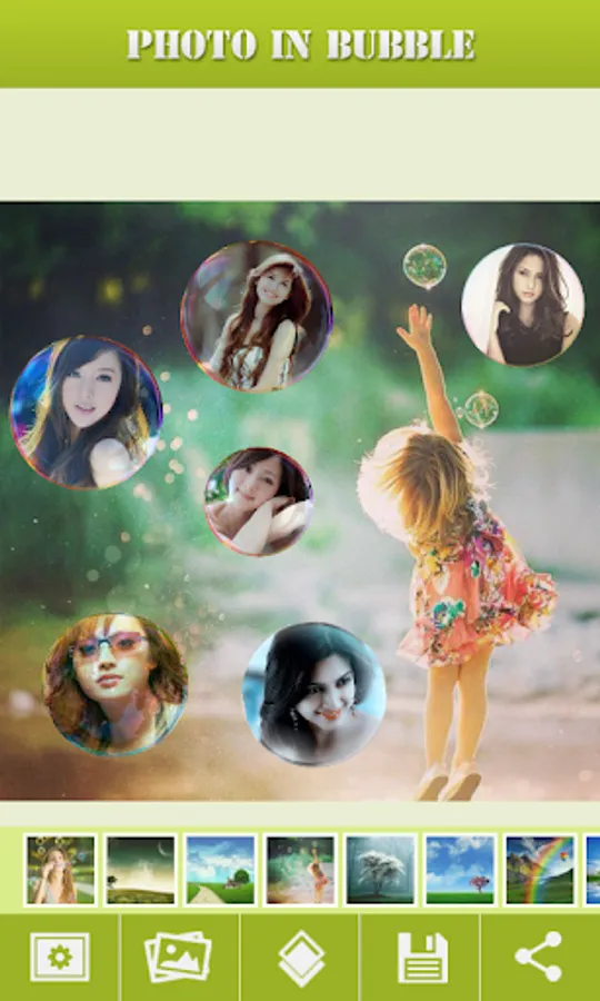 Photo in Bubble create awesome colored bubble over your photos making them awesome photos that you can save and share with friends. You can set different types of water bubbles with various photo. You can customize backgrounds, bubbles, quantity, size and angle.
