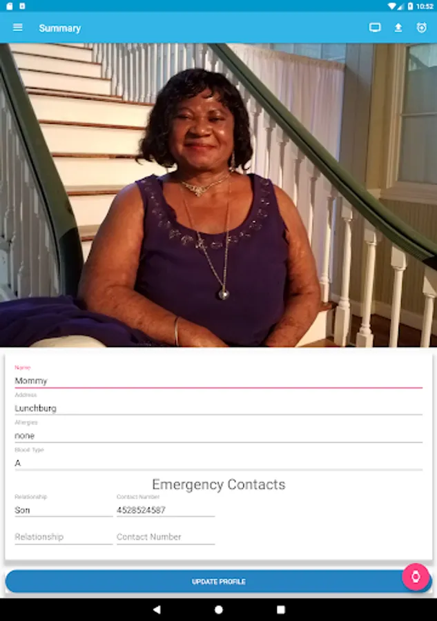 1. Summary section: shows full name, current address, allergies, blood type, two emergency contacts and short description/stories of the dementia patient.