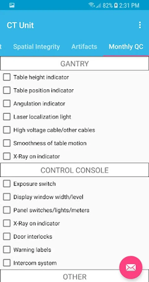 Daily QA allows radiology technologist and radiation oncology therapist to enter daily, weekly and monthly quality control data for MRI, Diagnostic CT Scanner, CT Simulator and Fluoroscopy units. The App offers a detailed report which can be easily accessed by medical physicists, radiologists, radiology managers, biomedical department and service engineers. The App meets state regulatory requirements and accreditation agencies standards (JCAHO, ACR, IAC).