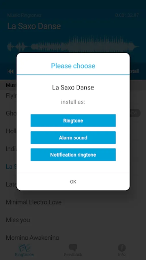 You can activate your favorite ringtone within the app as Ringtone, Alarm ringtone or Notification tone.