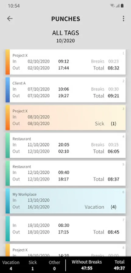 The log work tracker app also allows you to have different Tag for each clock punch to manage multiple Projects or Jobs. This is helpful when you work on a bigger project in milestones, work two jobs, or regularly work on different projects as freelancers/contractors.