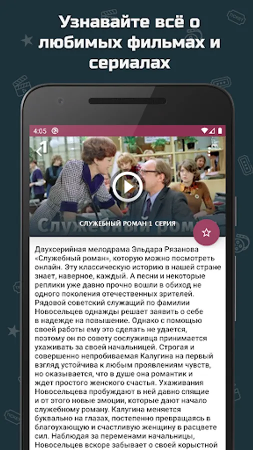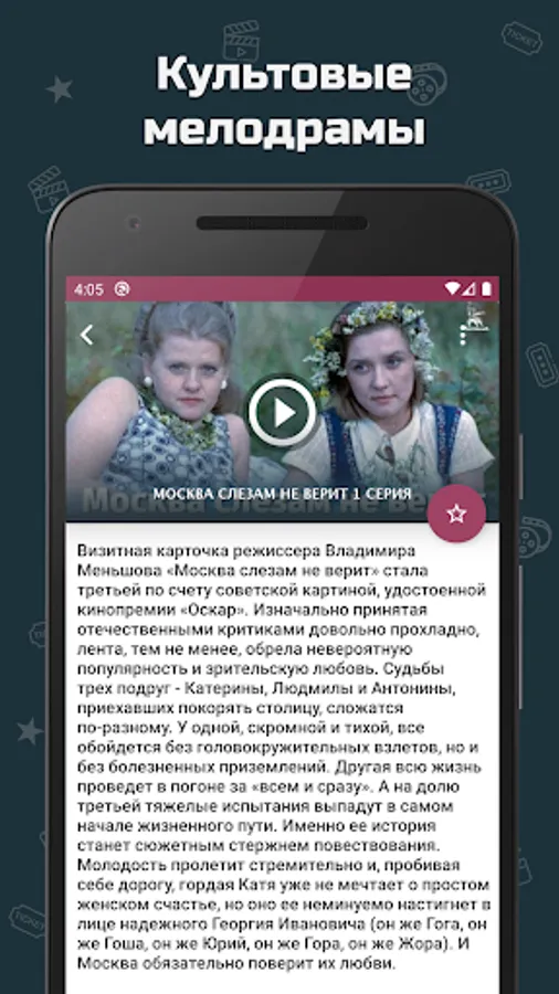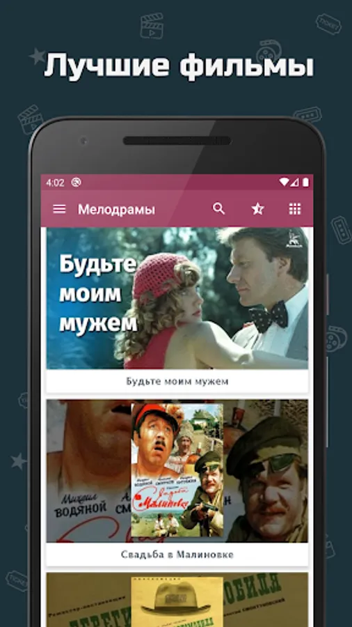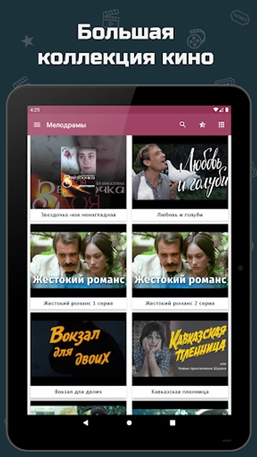 In the "Melodramas" application you can watch Russian movies online or read the description for it. The melodrama app is an unusual collection of Russian melodramas with which you can watch movies online.
