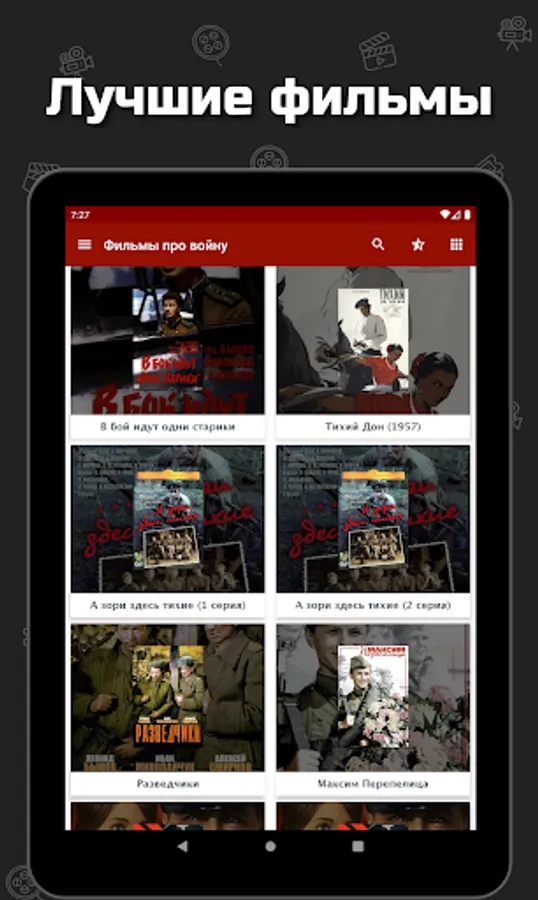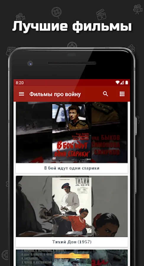 The Great Patriotic War left a deep mark in the history of the country. Soviet films about the war best convey the history of the feat of the Soviet people, the history of the Second World War (Great Patriotic War). The collection of the films about the war application consists not only of films and TV shows from the time of the Great Patriotic War, there are also films about the war from the times of the civil war, as well as other conflicts. The films in the application are suitable not only for May 9 or February 23, but also for watching Soviet war movies on any day. After all, Russian war films are a difficult story of our people for several decades and centuries.