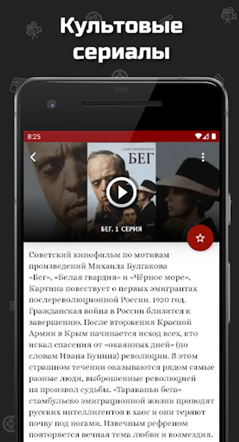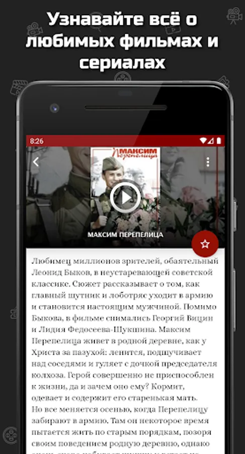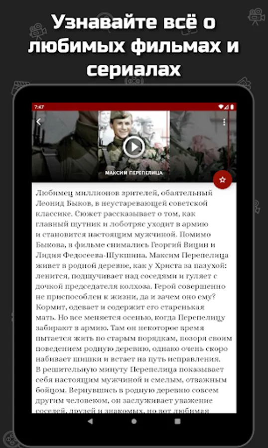 In the application you will find a description and the history of the creation of films and you can watch military series and films online.