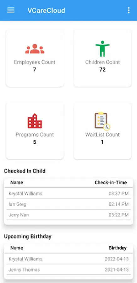 Our VCare software offers you to track children’s attendance, employee’s attendance, generate efficient billing and invoicing workflow, maintain health condition records, meal planner and offers to organize camps and events.