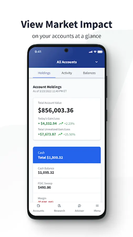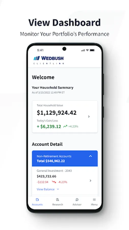 Clientlink is a mobile app for Wedbush clients to view their Accounts, Holdings, Activity, Balances and more. Other functionality includes access to Equity Research, viewing and sharing Documents, and the ability for clients to connect with their Financial Advisors directly through the app.