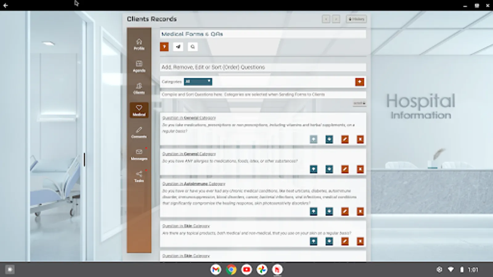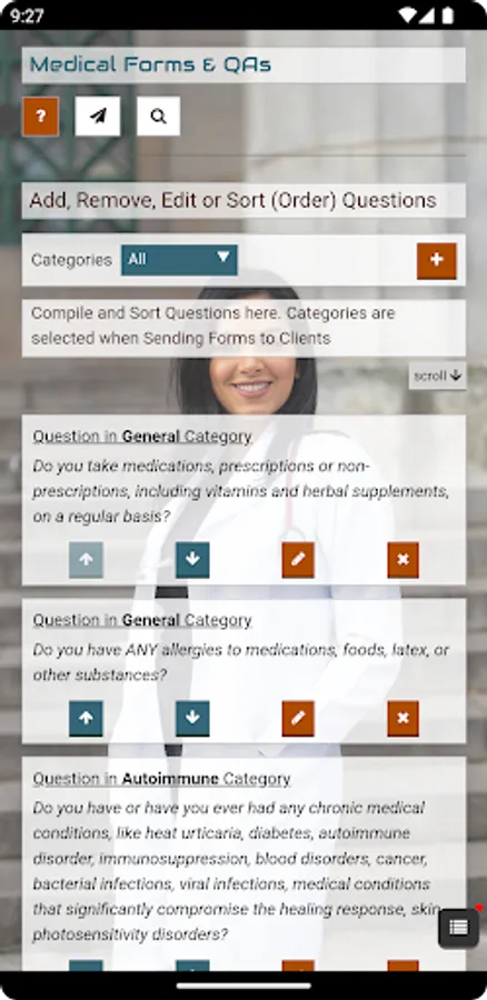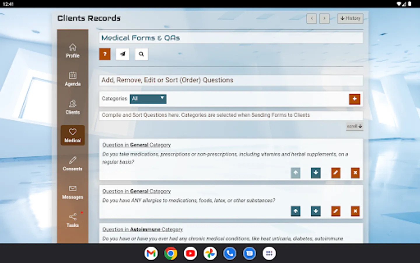 - the management of questions and categories for medical questionnaires and patient medical history.