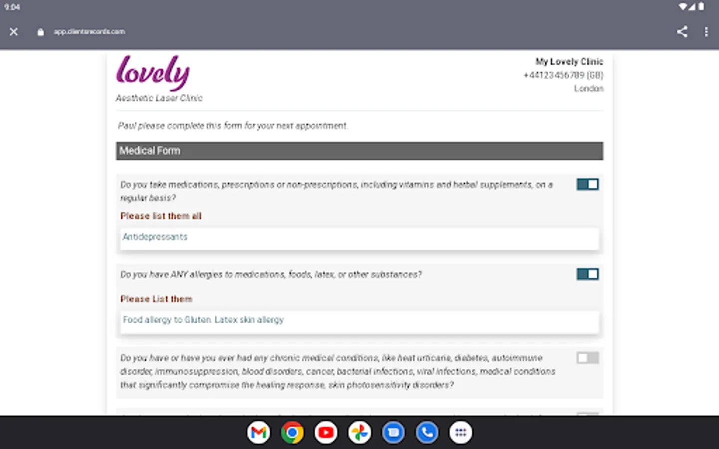 - online consent forms & medical questionnaires for patient completion and signatures.